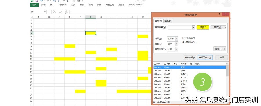然后点击查找全部,就会找到表格中所有的黄色单元格。如下图3处。