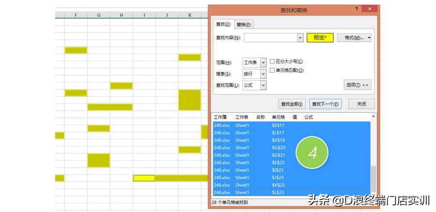 接下来应该如何选中所有黄色单元格呢?操作如下:在查询结果中按住shift键,批量选中所有的查询结构,Excel会自动选中表中所有的黄色单元格。(下图 4 处)