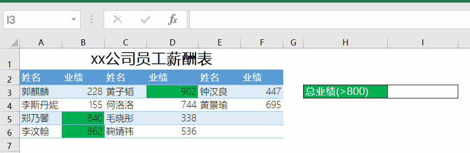 I3单元格数组公式{=SUM(IF(A3:F6>800,A3:F6,0))},即先用if去判断每个单元格是否大于800,是就是其本身,否就是0,然后外层用sum将矩阵结果求和出来。