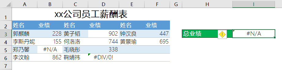 I3公式{=SUM(IFERROR(A3:F6,0))},也是一个数组公式,即先用iferror去判断是否有错误值,有的话赋值0,外层再用sum进行求和处理。