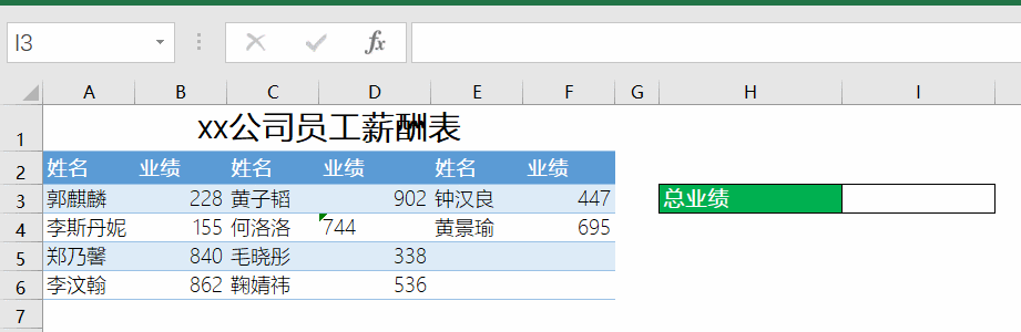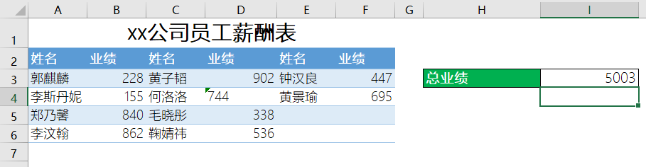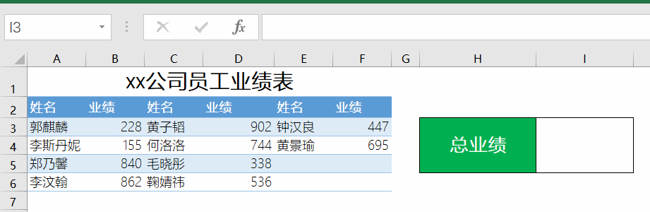 单元格I3=SUM(B3:B6,D3:D6,F3:F6),这里用到了sum的多个参数,多个不连续的引用范围。
