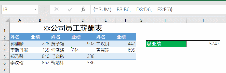 如何操作的呢?先输入=SUM(--B3:B6,--D3:D6,--F3:F6),然后三键连发Ctrl+Shift+Enter,完成数组公式的输入。