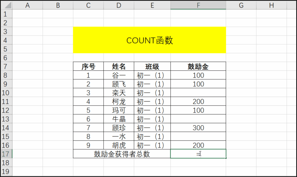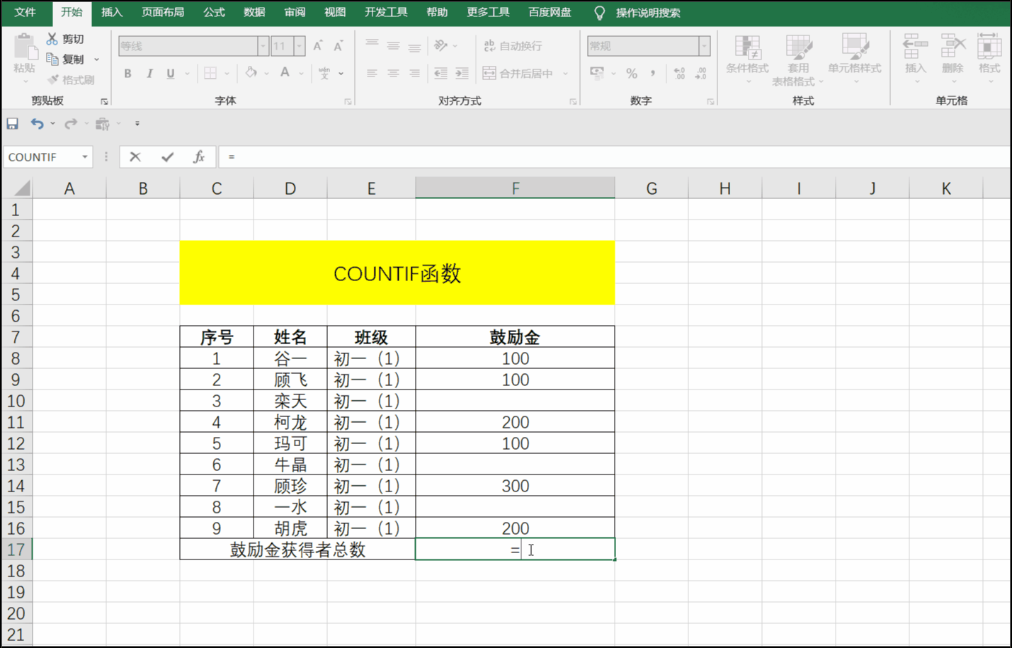 今天COUNTIF函数的分享,继续基于以上案例,统计鼓励金≥200的人数。