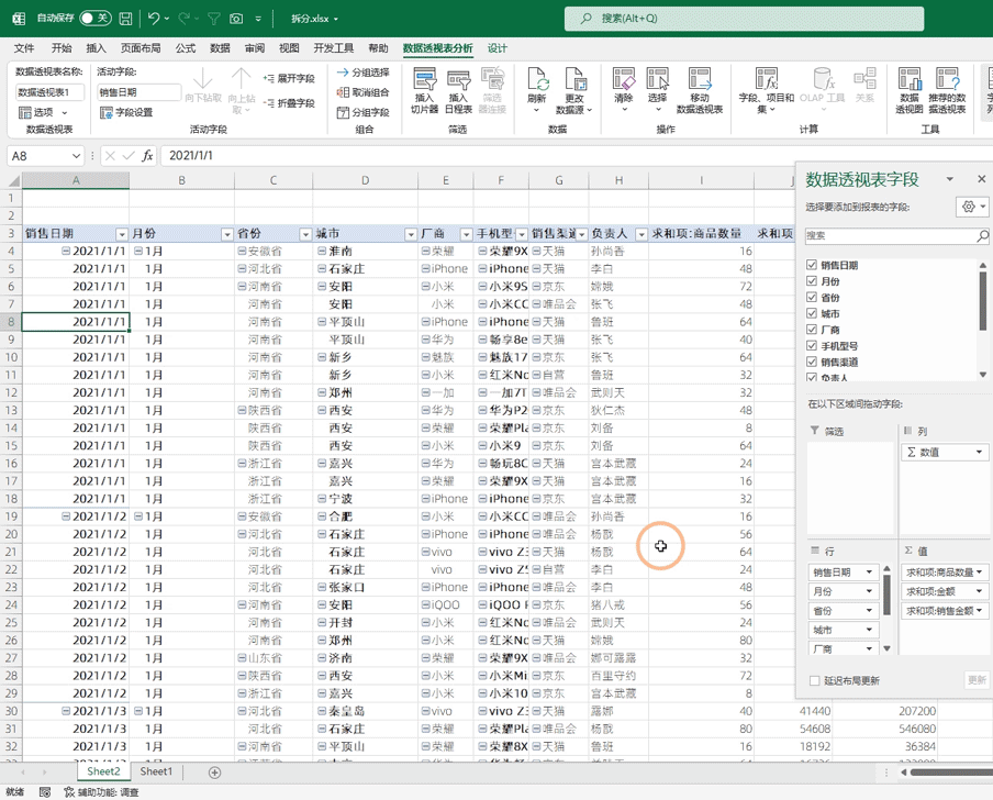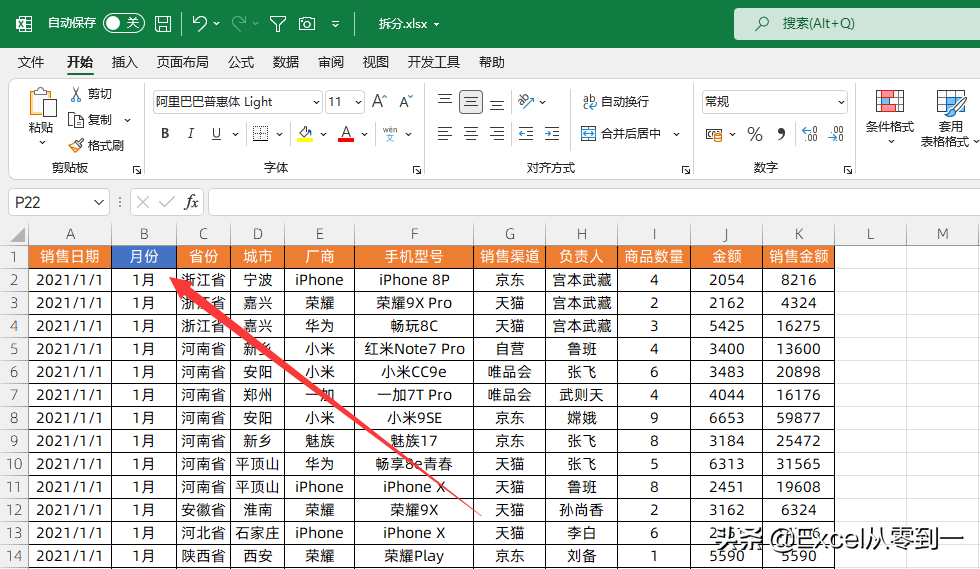 所谓的拆分字段,就是我们想要根据那个字段进行sheet拆分,下图是一个2021年的订单数据,现在我们想要根据【月份】将其拆分开,让每一个月占据一个Sheet,这个月份就是拆分字段。表格中没有拆分字段的话就需要构建一个出来