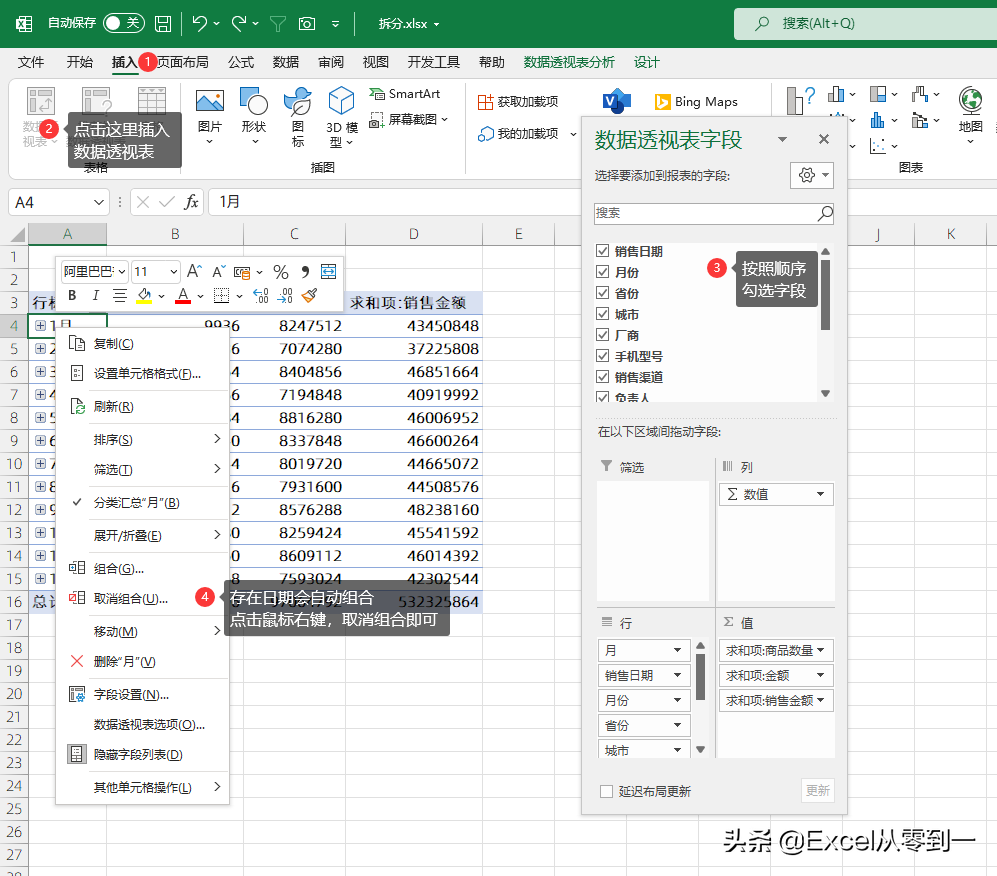 转换为超级表后,我们直接【插入】功能组,选择【数据透视表】在跳出的界面中直接点击【确定】就会新建一个透视表,在右侧的字段列表中,直接按照顺序勾选字段即可,如果数据源中存在日期会被自动组合,我们只需要点击鼠标右键选择【取消组合】即可