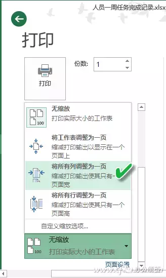 其实,这时候我们只需从打印设置窗口中,把缩放选择列表中的选项调整为“将所有列调整为一页”,这样打印时就不会分开两页或更多页打印了。总体速度也提升了。