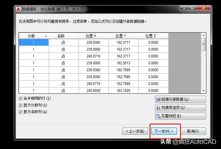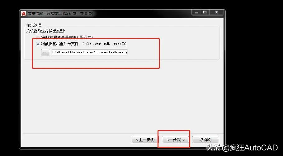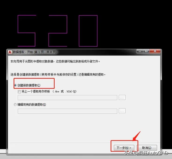 第二步:在先前绘制好的CAD里面单击工具——数据提取,选择“创建新数据提取”,单击下一步并且给文件起个你喜欢的名字,然后确定。