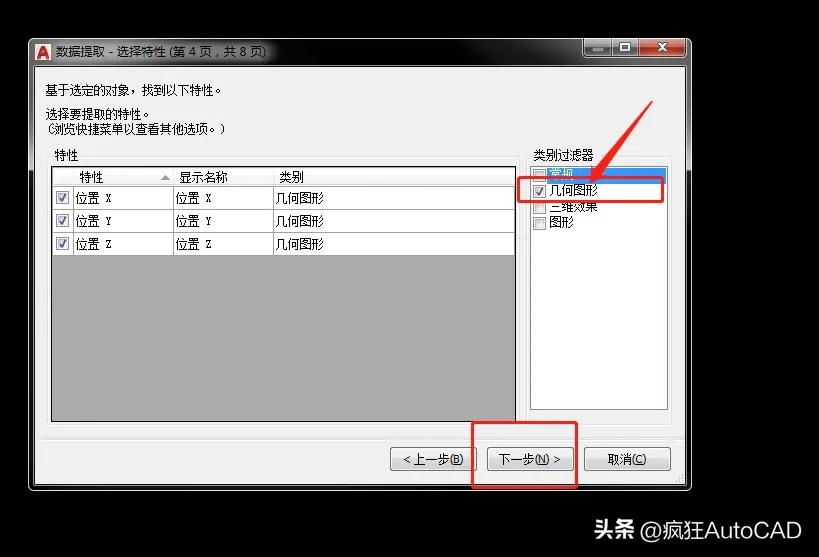 第五步:只勾选“几何图形”然后点击下一步。这样就可以只导出坐标点了。