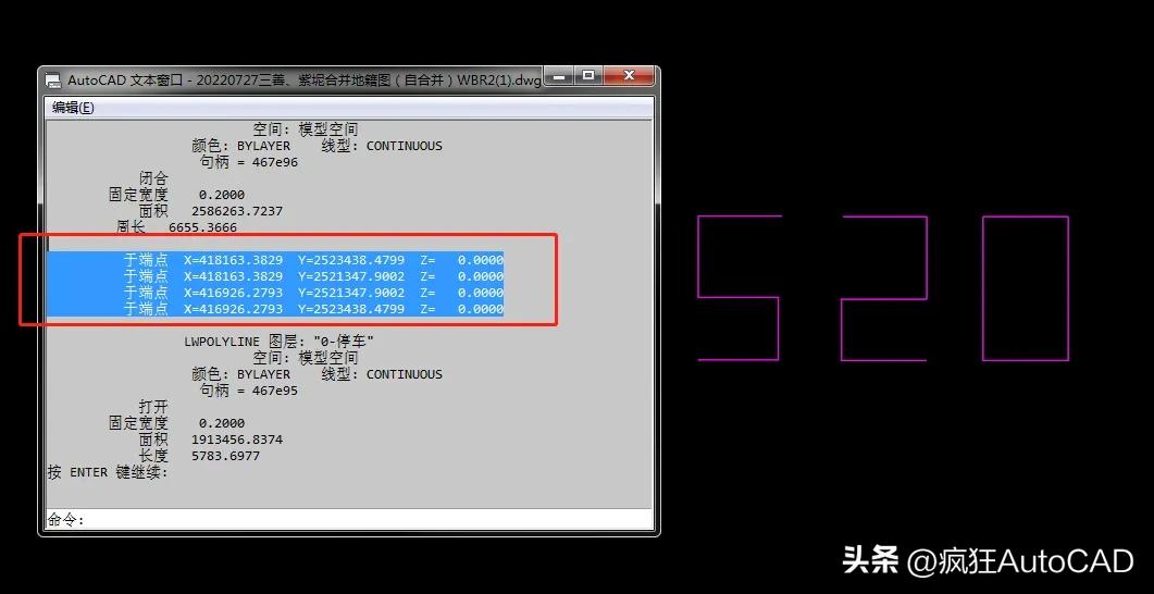 按照流程首先还是要用CAD多段线简单绘制一个520形状,然后全选图形用快捷键li即可看到这个形状的坐标,复制这些坐标到表格里面即可发给那个她了[灵光一闪]
