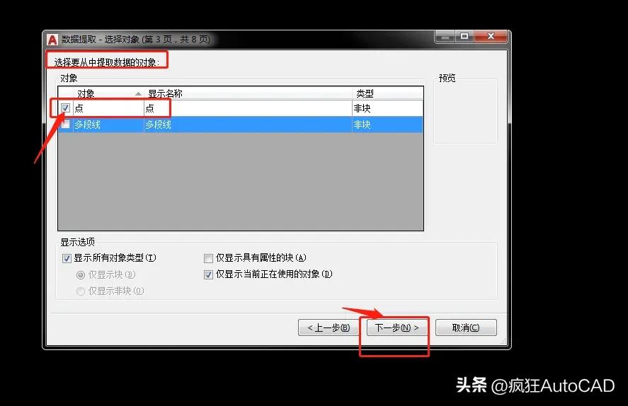 第四步:选择要提取的对象“点”。单击下一步。