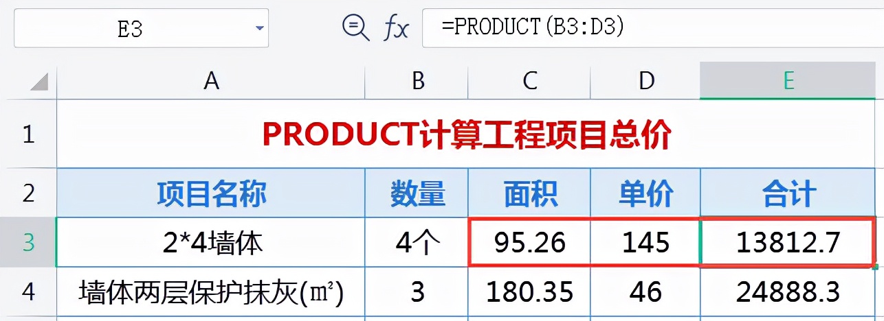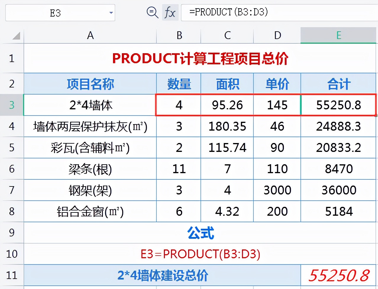 在E11单元格输入公式:=PRODUCT(B3:D3),按回车键即可计算出2*4墙体建设总价。见下图: