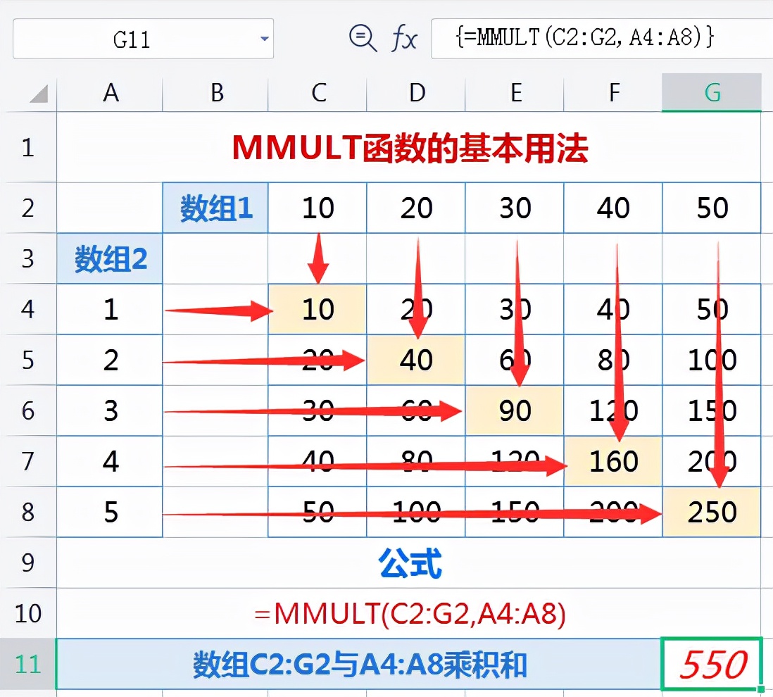 如上图所示,第一数组的第一个值10乘以第二数组的第一个值1,等于10,即C2乘以A4,以此类推。多步的乘积完成之后,按照计算理论,该函数还会将结果加起来,即10+40+90+160+250=550。