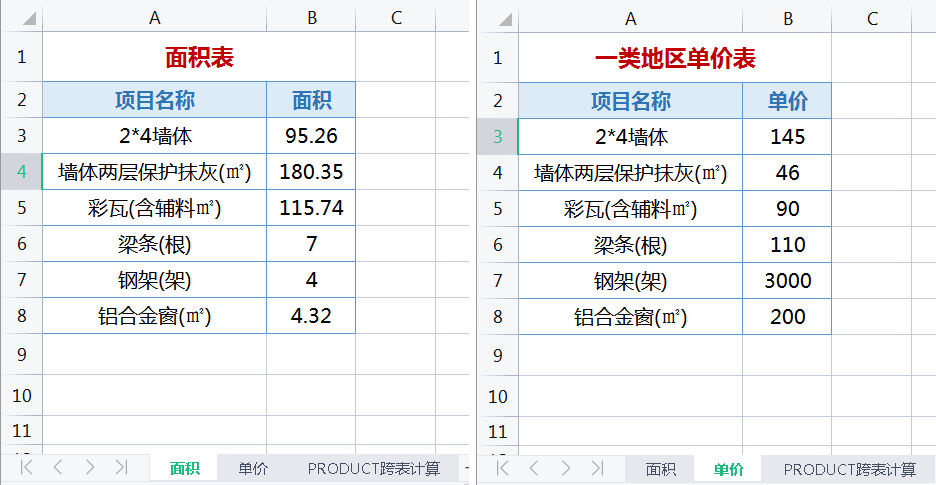 跟上一个例子类似,本例中,各种工程项目的面积和单价分布在两个表格里,需要跨表格把对应项目的面积和单价进行相乘,计算出每个项目的总价。见下图: