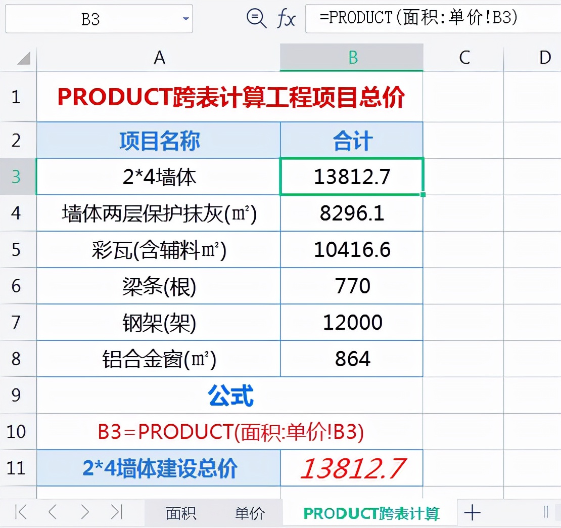 在总价表B3单元格输入公式:=PRODUCT(面积:单价!B3),按回车键即可跨表格计算出2*4墙体建设总价。见下图: