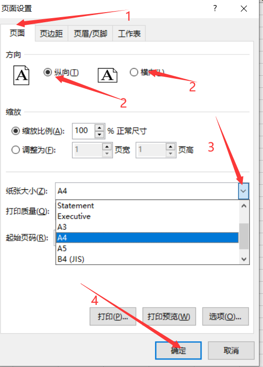 ②切换到【页面】选项卡,可以设置纸张大小、横向纵向等。【页边距】同理,按实际需求设置。