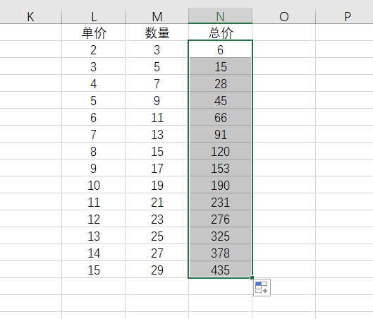 在总价这个单元格输入【=L2*M2】,按下回车即可。而且也能往下填充,不用重复输入公式。