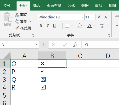 在单元格里面输入O P Q R 然后将字体更改成windings2
