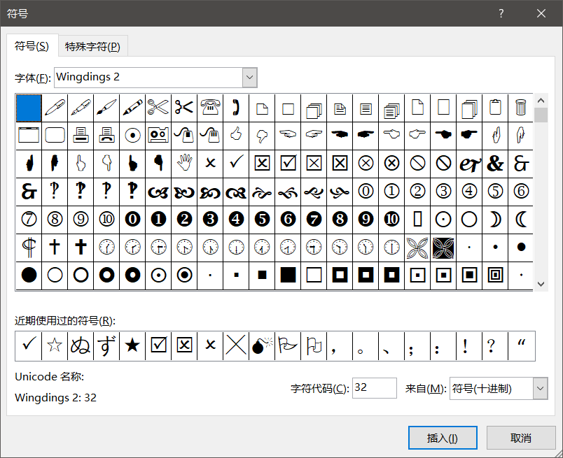 在插入选项卡的最右边,有一个字符,插入之后,在里面可以进行各种选择了,如下所示: