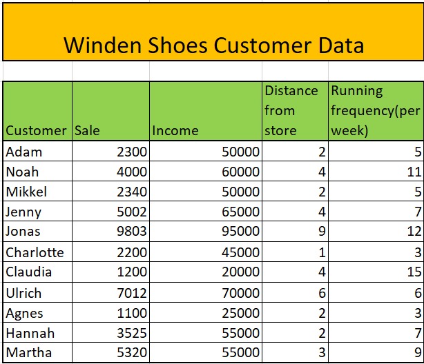 Winden镇有一家卖鞋的公司。该公司希望通过考虑以下因素来预测每个客户的销售情况:客户收入、离家距离、客户每周的跑步频率。