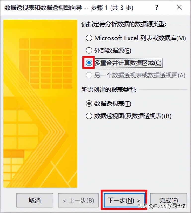 3. 按 Alt+D+P --> 在弹出的对话框中选择“多重合并计算数据区域”--> 点击“下一步”