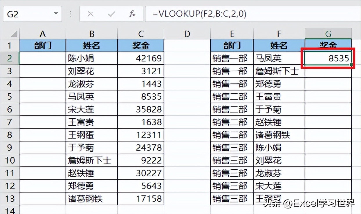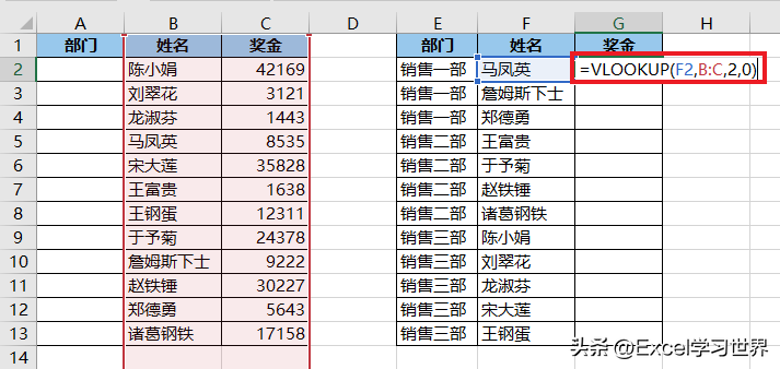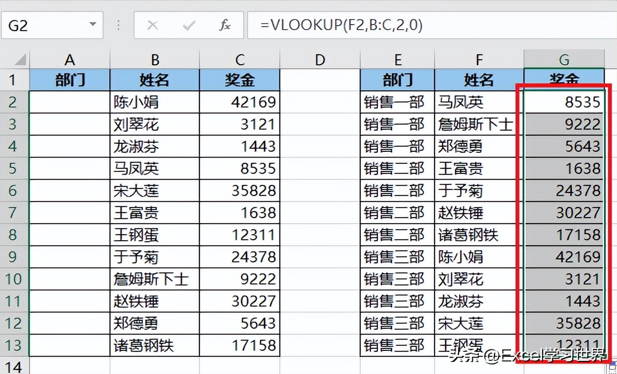 16. 删除数据透视表 --> 在 G2 单元格中用 vlookup 公式查找姓名对应的奖金 --> 下拉复制公式