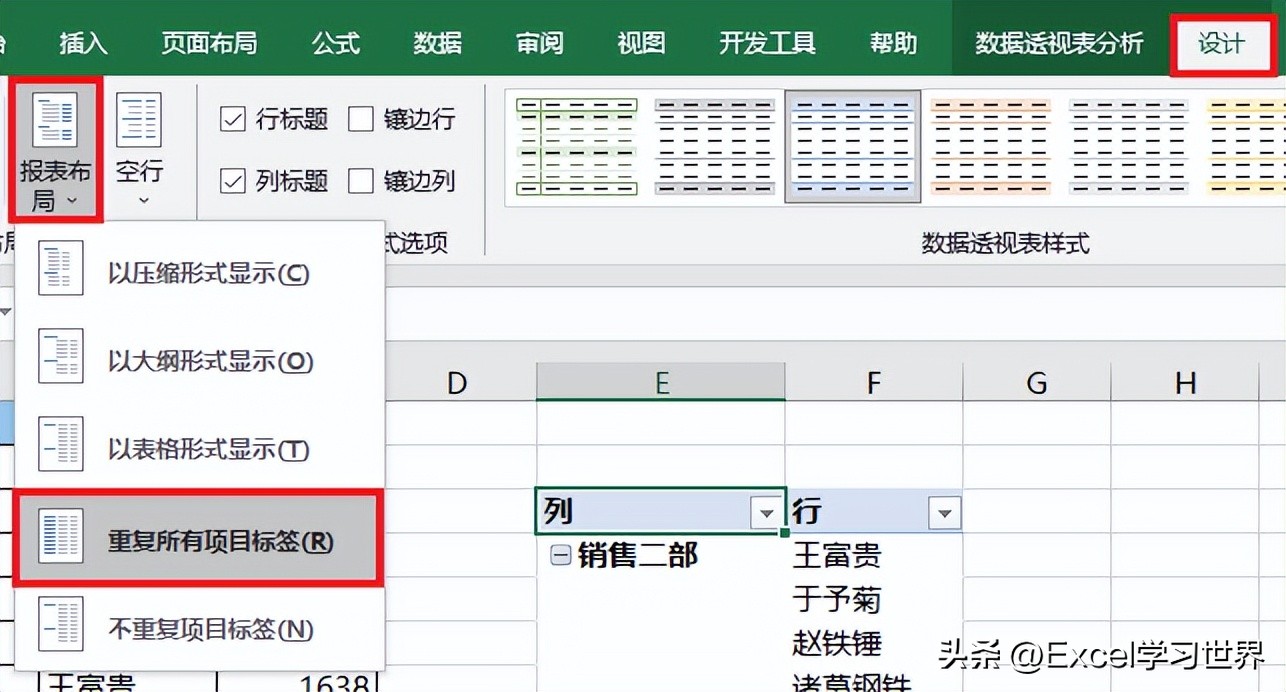 10. 选择“设计”-->“报表布局”-->“重复所有项目标签”