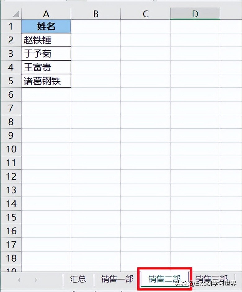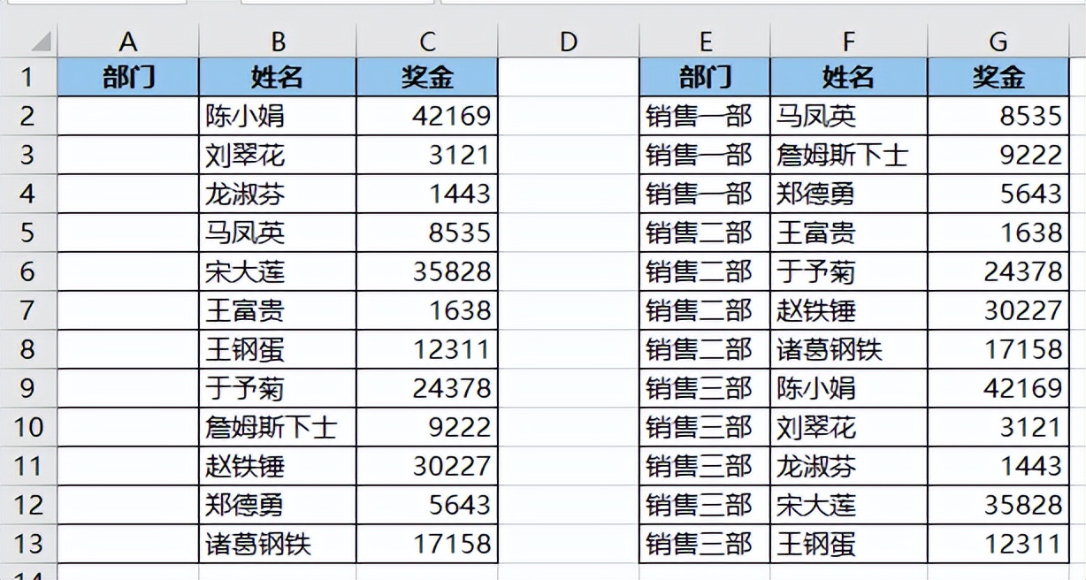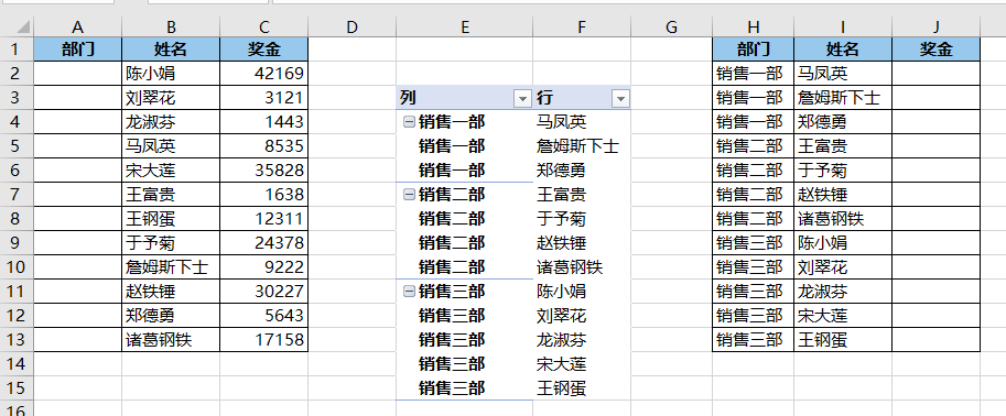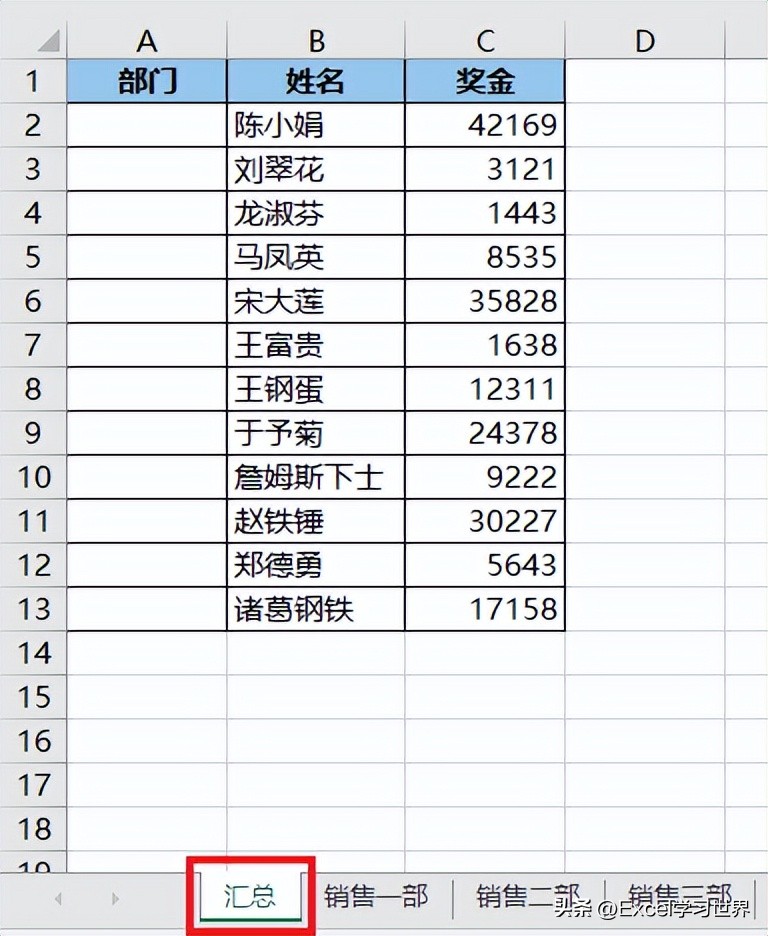 下图 1 至 3 是每个以部门命名的工作表,其中列出了个部门的员工姓名。下图 4 的奖金汇总表中,没有员工的部门,如何快速匹配上?