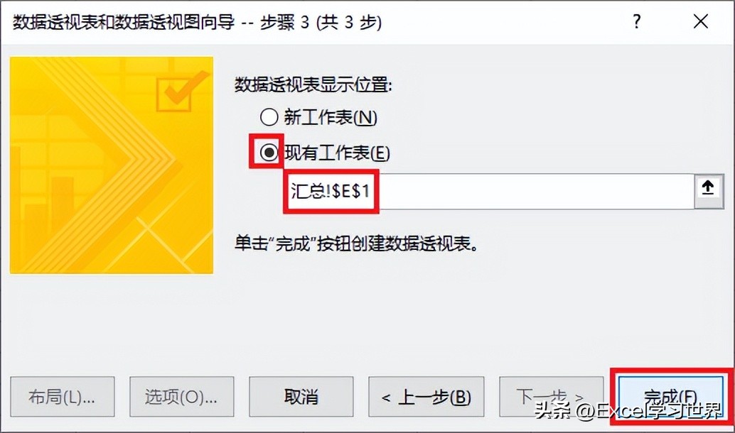 7. 在弹出的对话框中选择“现有工作表”及所需上传至的位置 --> 点击“完成”