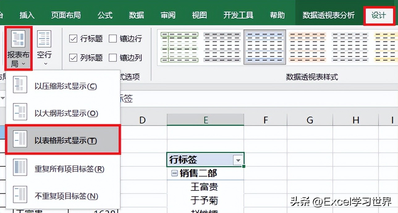 9. 选中数据表的任意单元格 --> 选择菜单栏的“设计”-->“报表布局”-->“以表格形式显示”