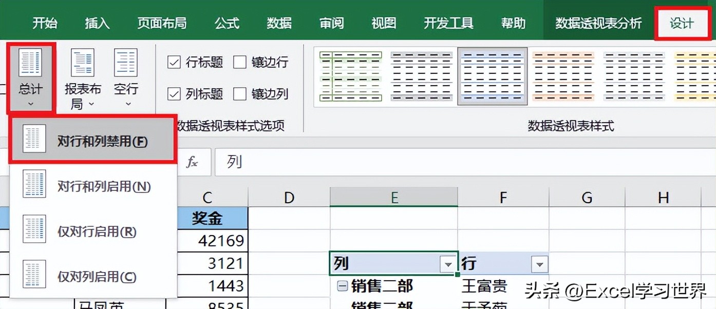 11. 选择“设计”-->“总计”-->“对行和列禁用”