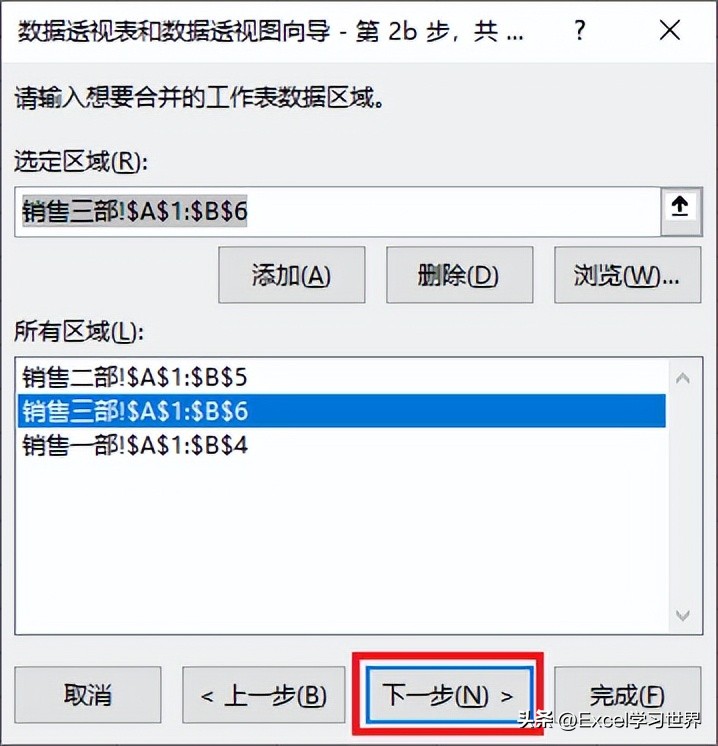 6. 重复同样的步骤将所有工作表中的数据表都添加到区域 --> 点击“下一步”