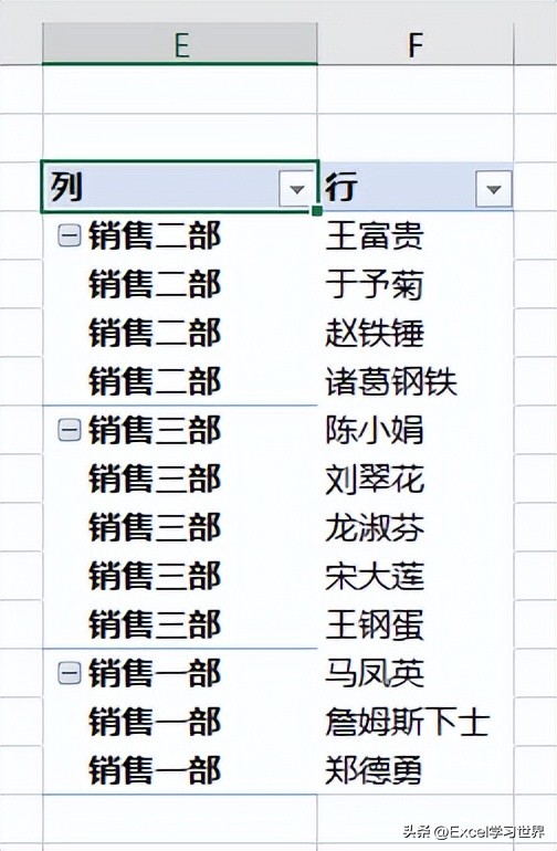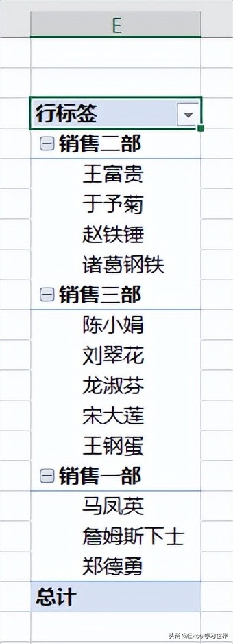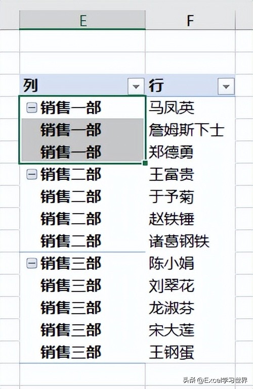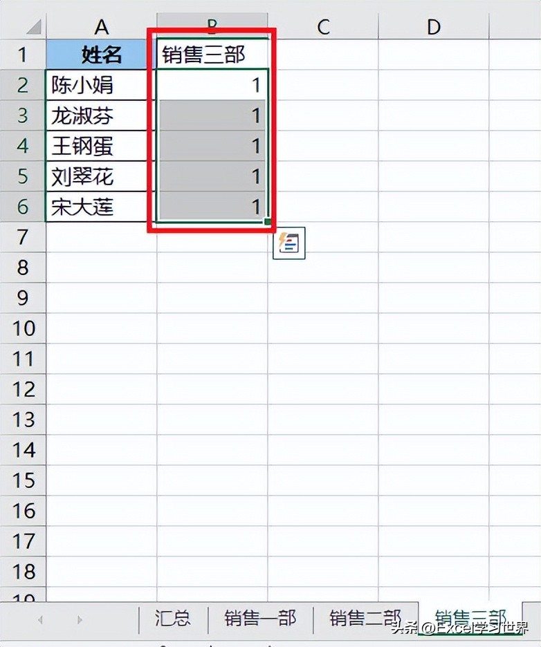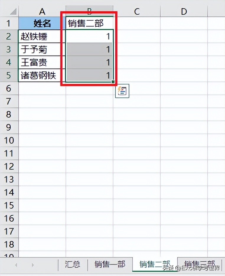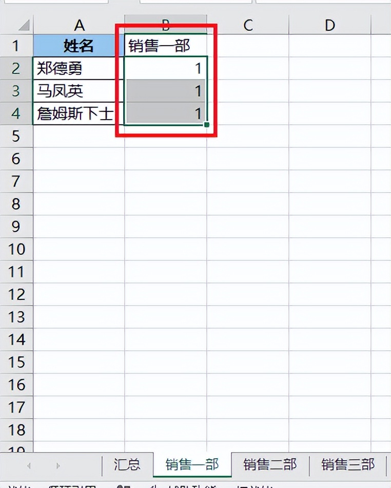1. 给“销售一部”工作表中的数据表添加辅助列:标题为“销售一部”,数据全部填充“1”