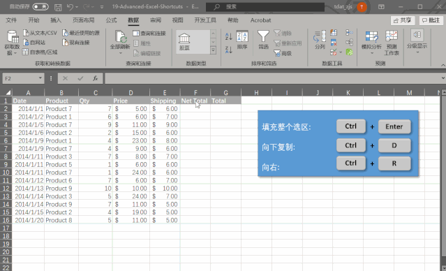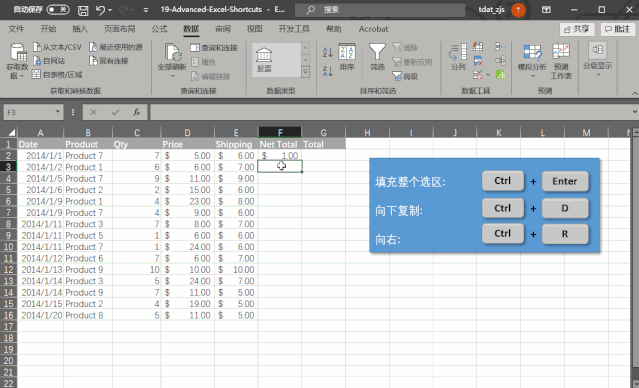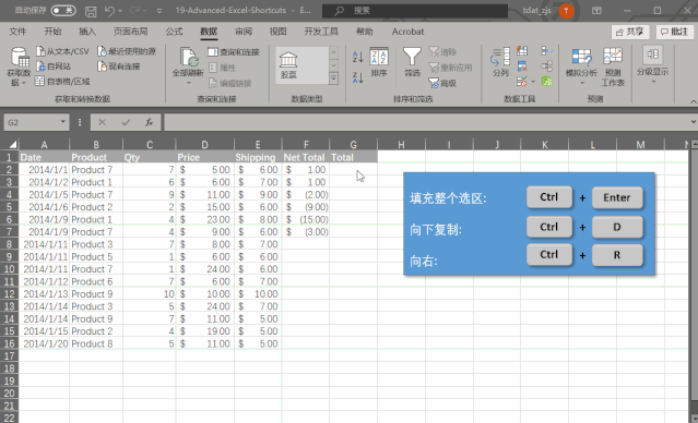 如果你没有选中整个选区,利用第六条快捷方式完成对某个区域的填充,那么使用 Ctrl + D 也可以让你复制当前活动单元格正上方的单元格内容。相应的,你也可以使用 Ctrl + R复制一个左侧单元格的内容。