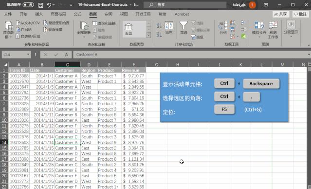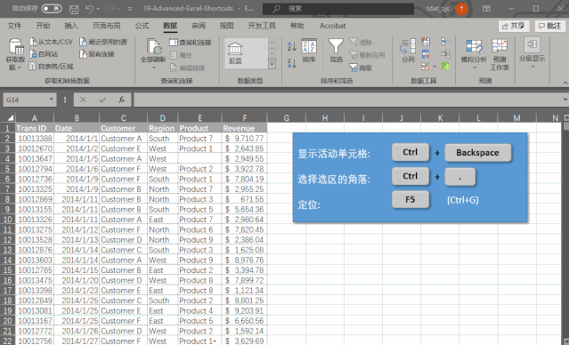 如果你选中了一个巨大的单元格区域,但你又不想因为返回最初那个活动单元格而取消选中的单元格区域,这时,你可以通过键入 Ctrl + Backspace返回活动单元格。