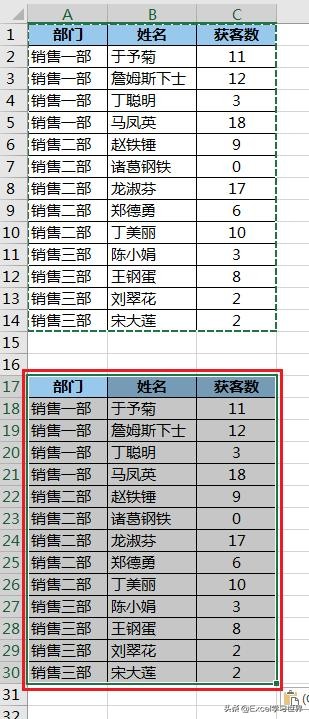 10. 将原始表格复制粘贴到空白区域。实际工作中,可能需要重新开一个工作簿,这里为了教学方便,我就放在下方。