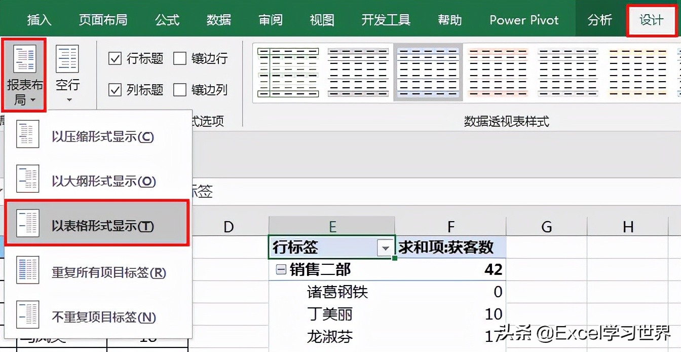 4. 选中数据透视表的任意单元格 --> 选择菜单栏的“设计”-->“报表布局”-->“以表格形式显示”