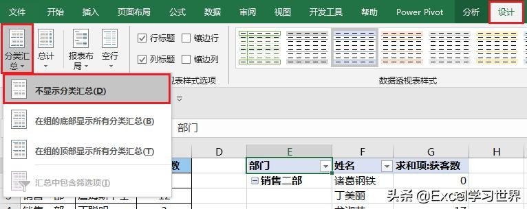 6. 选择菜单栏的“设计”-->“分类汇总”-->“不显示分类汇总”