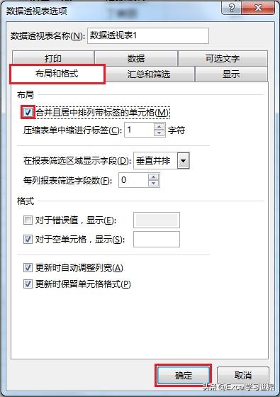 8. 在弹出的对话框中选择“布局和格式”选项卡 --> 勾选“合并且居中排列带标签的单元格”--> 单击“确定”
