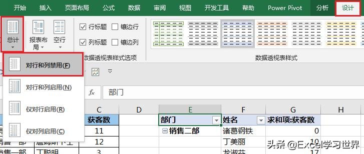 5. 选择菜单栏的“设计”-->“总计”-->“对行和列禁用”
