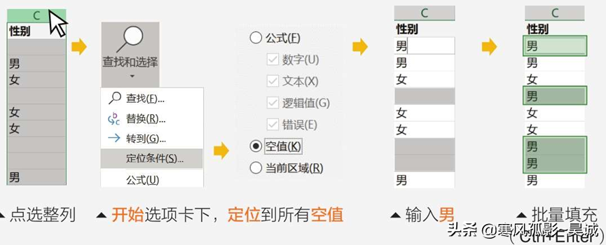利用定位功能,还能按条件批量选中目标区域。最常用到的就是选定所有空白单元格,然后批量输入相同内容,填补空白单元格。例如,先选定整列性别,然后定位到该列中的所有空白,只要输入一个“男”,就能批量填充到剩余的空单元格中。