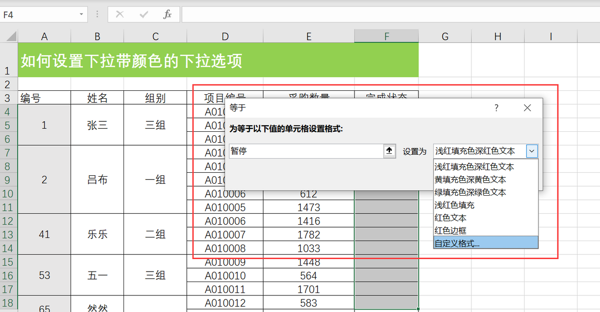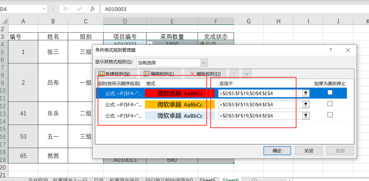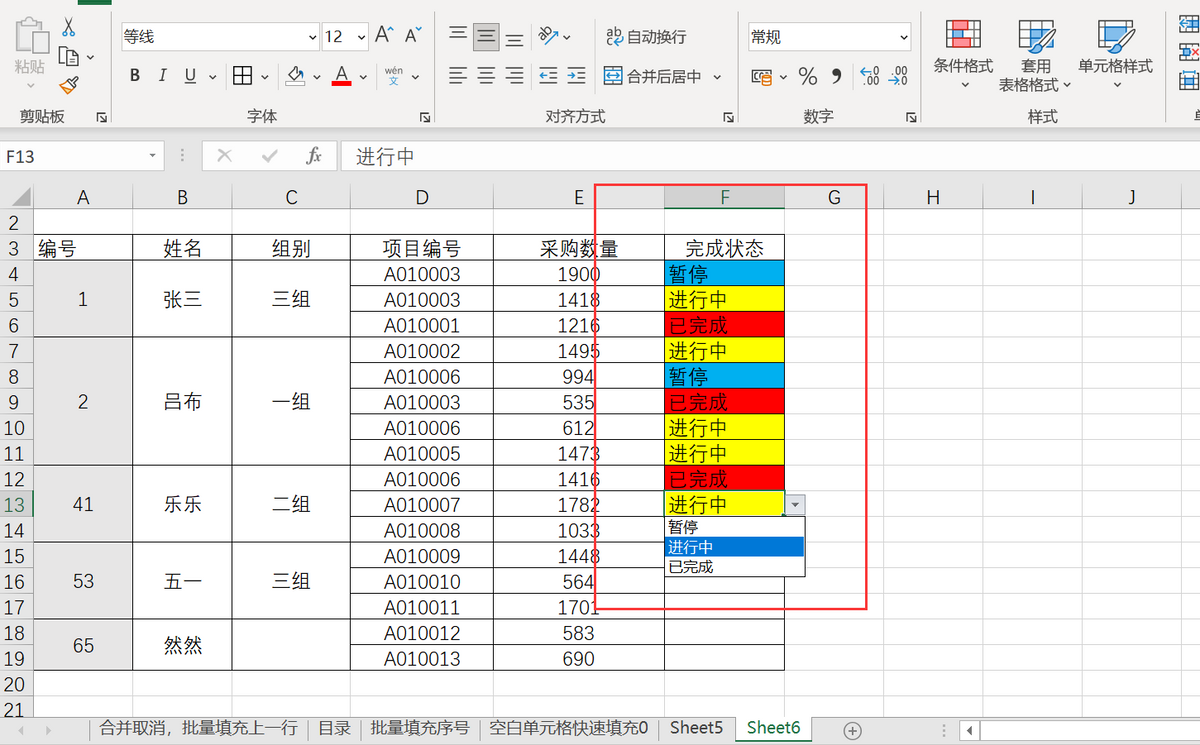 点击确定,单击“完成状态”,下拉选择不同的状态,整行填充上不同的颜色,因为A、B、C三列使用了合并单元格,故在条件设置里仅设置了D、E、F列。