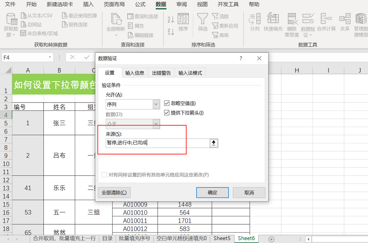 弹出窗口,设置验证条件,单击允许,选择序列,在来源输入框里输入“暂停、进行中、已完成”三个选项,注意选项之间是英文逗号间隔。