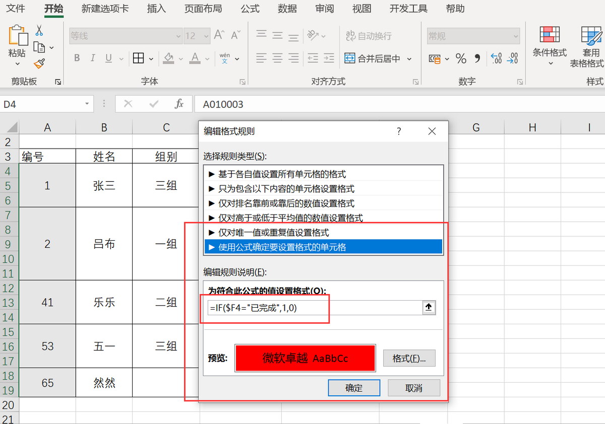 如果想根据完成状态标记出整行的数据,选中整个表格区域,在条件格式下方新建规则,弹出窗口,选择规则类型“使用公式确定要设置格式的单元格”,在下方输入框里输入函数公式“=IF($F4="已完成",1,0)”