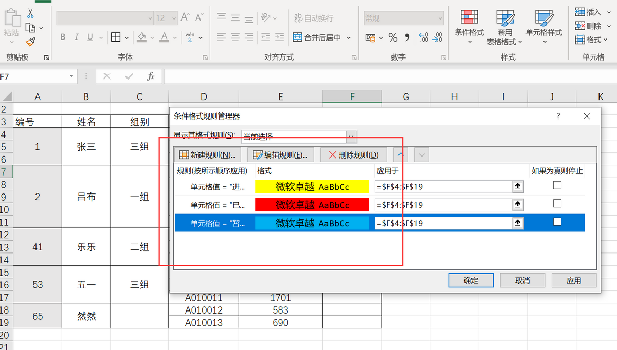 同样的方法设置其他两个状态的填充颜色,设置的时候,只需要复制公式,修改公式里的条件判断值即可。