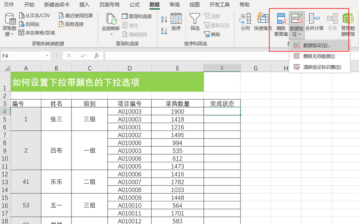 打开EXCEL表格,选中“完成状态”这一列,点击菜单栏上“数据-数据验证-数据验证”。