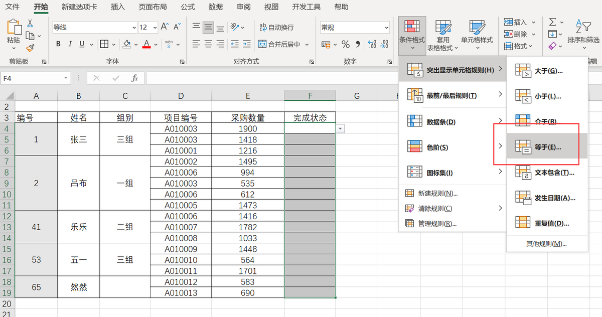 设置好下拉选项后,如果只需要完成状态这一列里标记颜色,则只选择完成状态一列,点击菜单栏上“条件格式-突出显示单元格规则-等于”。