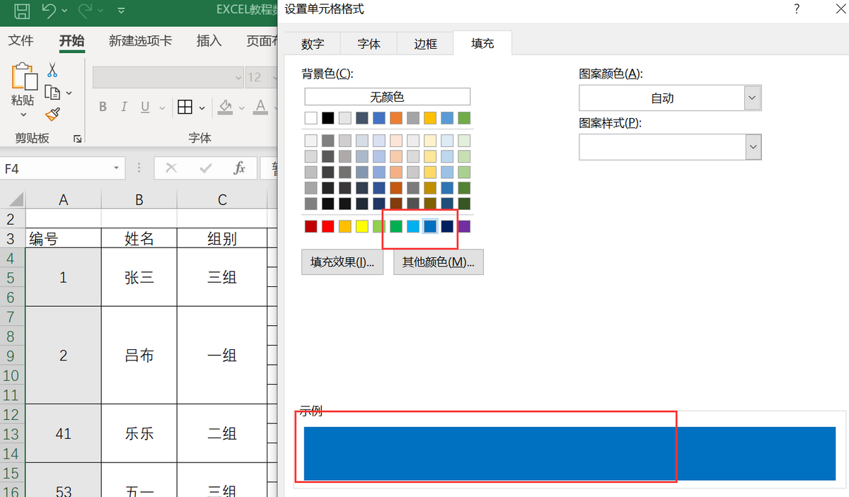 弹出“设置单元格格式”窗口,点击“填充”,选择填充色。
