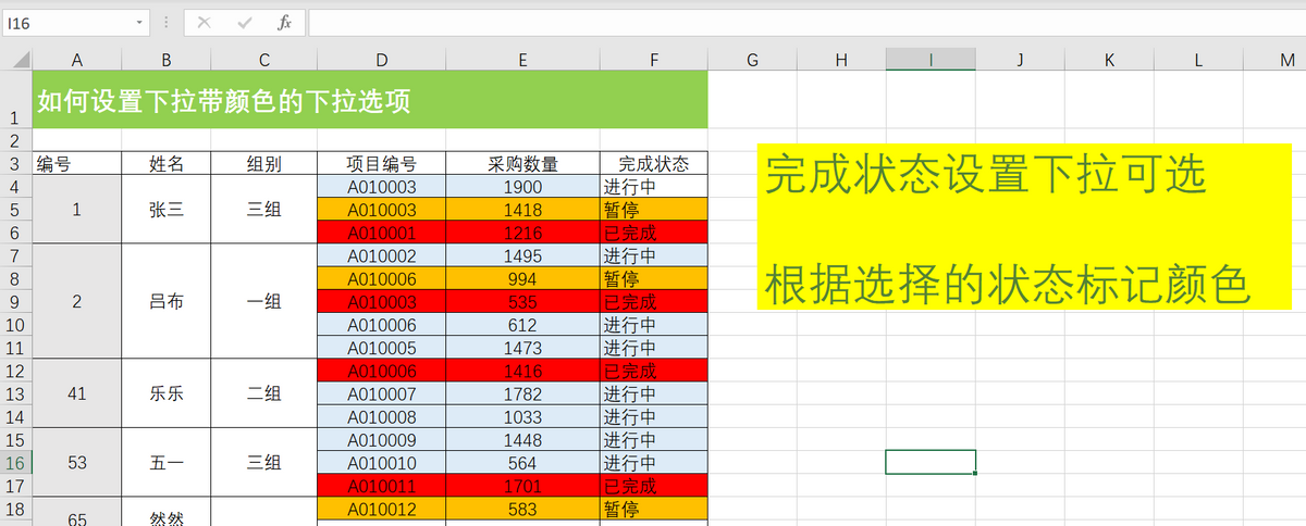 在上一章节里,我们学习了如何在EXCEL表格里设置下拉选项,这一章节里我们分享如何将下拉选项和条件格式结合使用,如下方表格里完成状态通过下拉列表选择状态,状态不同则标记不同的颜色(可单列标记或整行标记)。