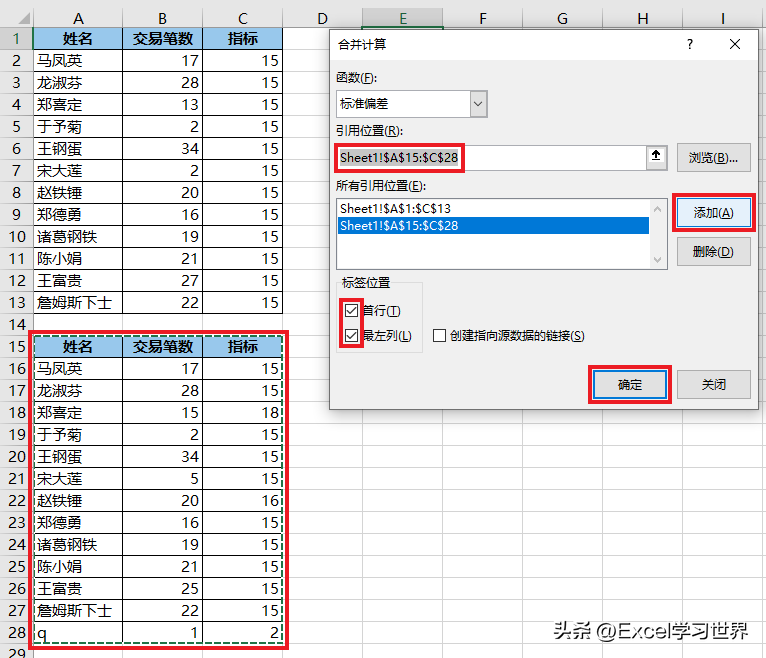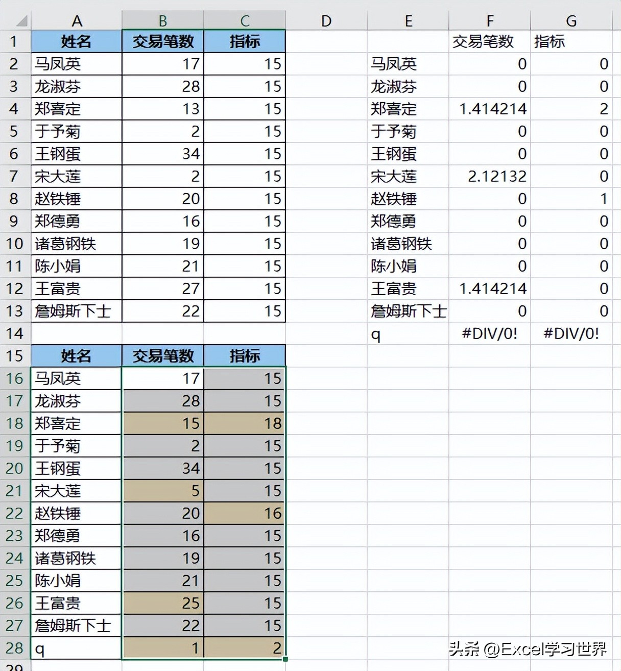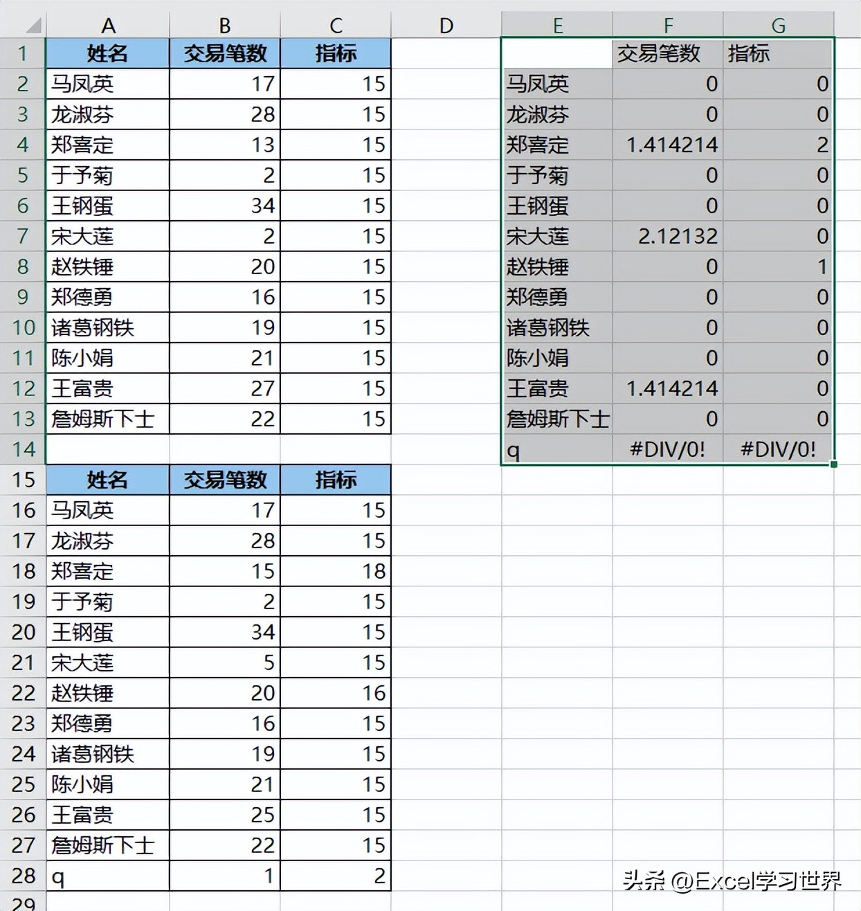 具体公式有点复杂,这里就不展开说了,总之大家只要记住,如果两个数据表有差异,标准偏差的计算结果就不是 0。利用这个特性,就能起到找出差异值的作用。