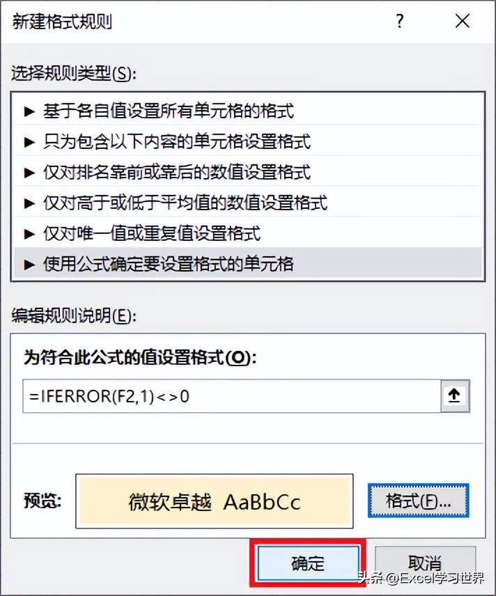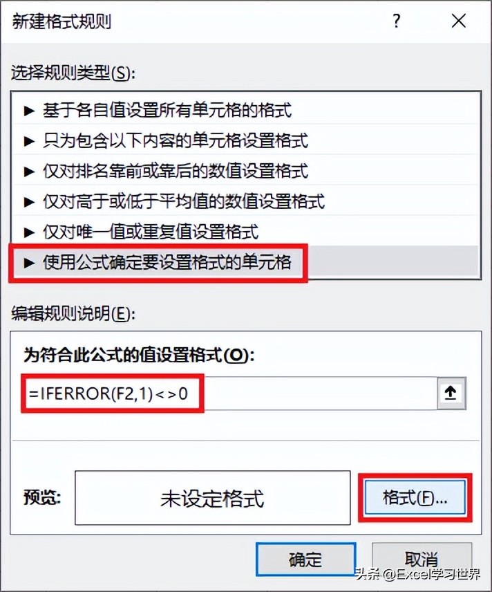 8. 在弹出的对话框中选择“使用公式确定要设置格式的单元格”--> 输入以下公式 --> 点击“格式”按钮: